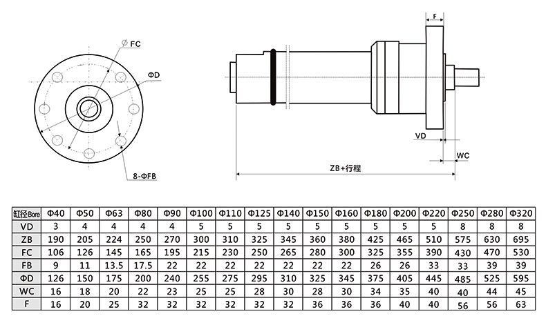 冶金液壓缸頭部圓法蘭外形安裝尺寸圖